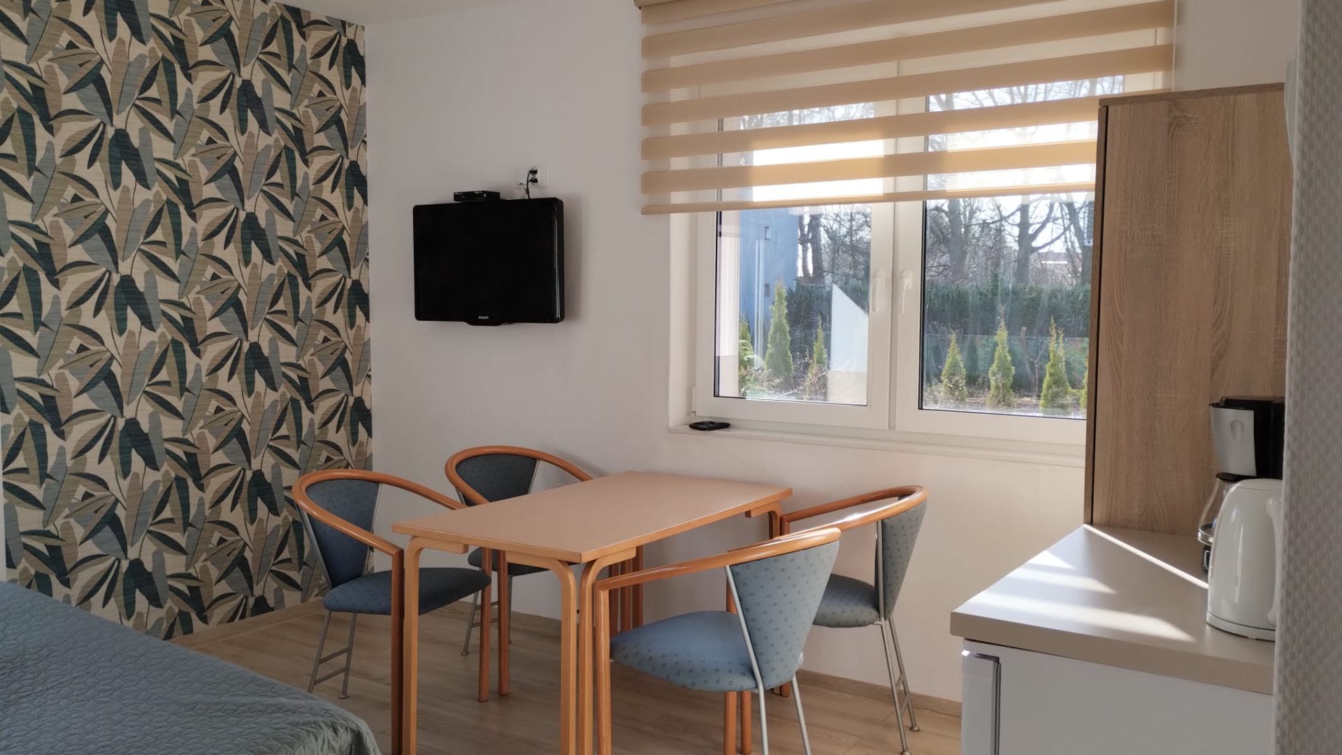 Dwupokojowe studio rodzinne ze standardowym wyposażeniem. Miejsce dla wygodnego pobytu do czterech osób. W pierwszym pokoju znajdują się dwa łóżka, z opcją zestawienia w jedno małżeńskie, telewizor, lodówka i czajnik bezprzewodowy oraz talerzyki i szklanki wzraz z podstawowymi sztućcami. W drugim pokoju znajdują się 2 łóżka jednoosobowe. Położenie na parterze. Łazienka w ramach studio.